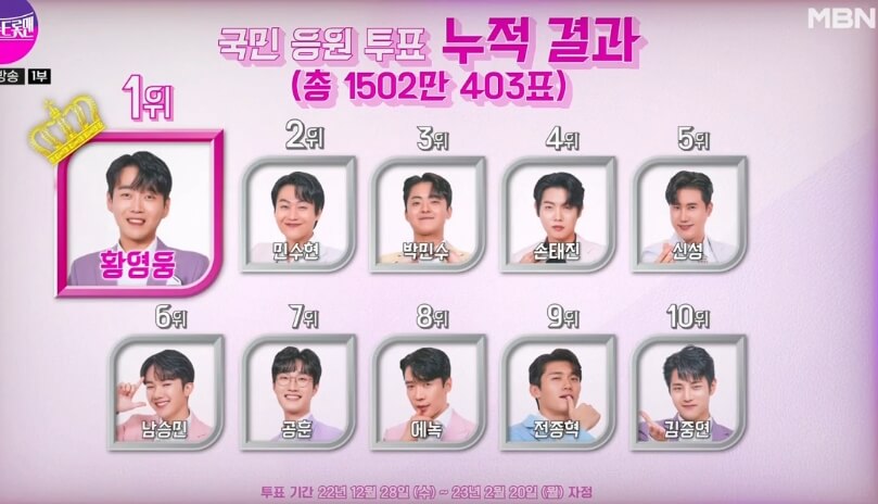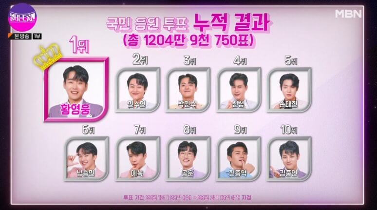 🔽 황영웅,민수현,박민수,손태진,에녹,공훈,신성,김중연까지 총 8명이 불타는 트롯맨 결승무대에 진출 했습니다.