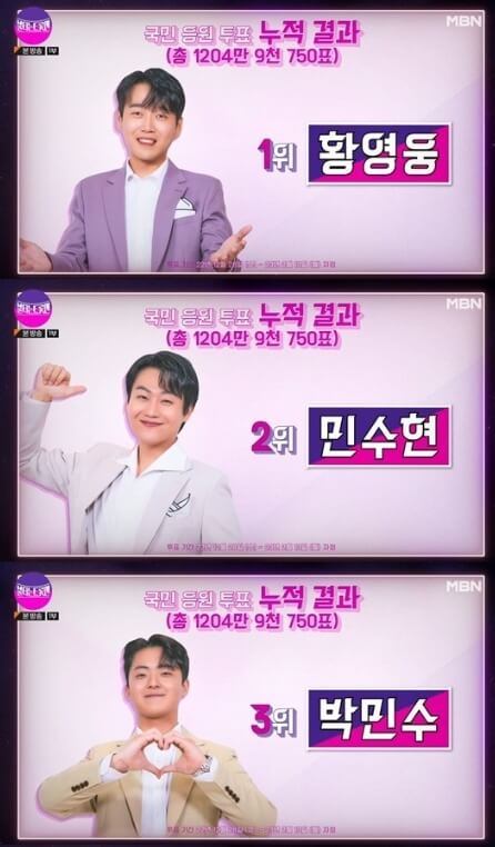 🔽 황영웅,민수현,박민수,손태진,에녹,공훈,신성,김중연까지 총 8명이 불타는 트롯맨 결승무대에 진출 했습니다.